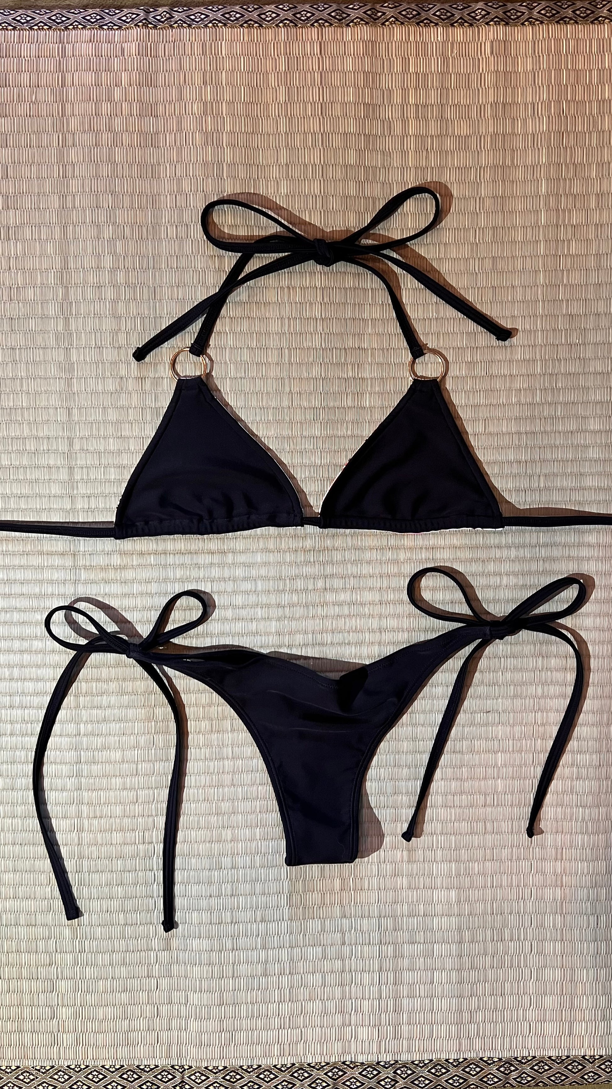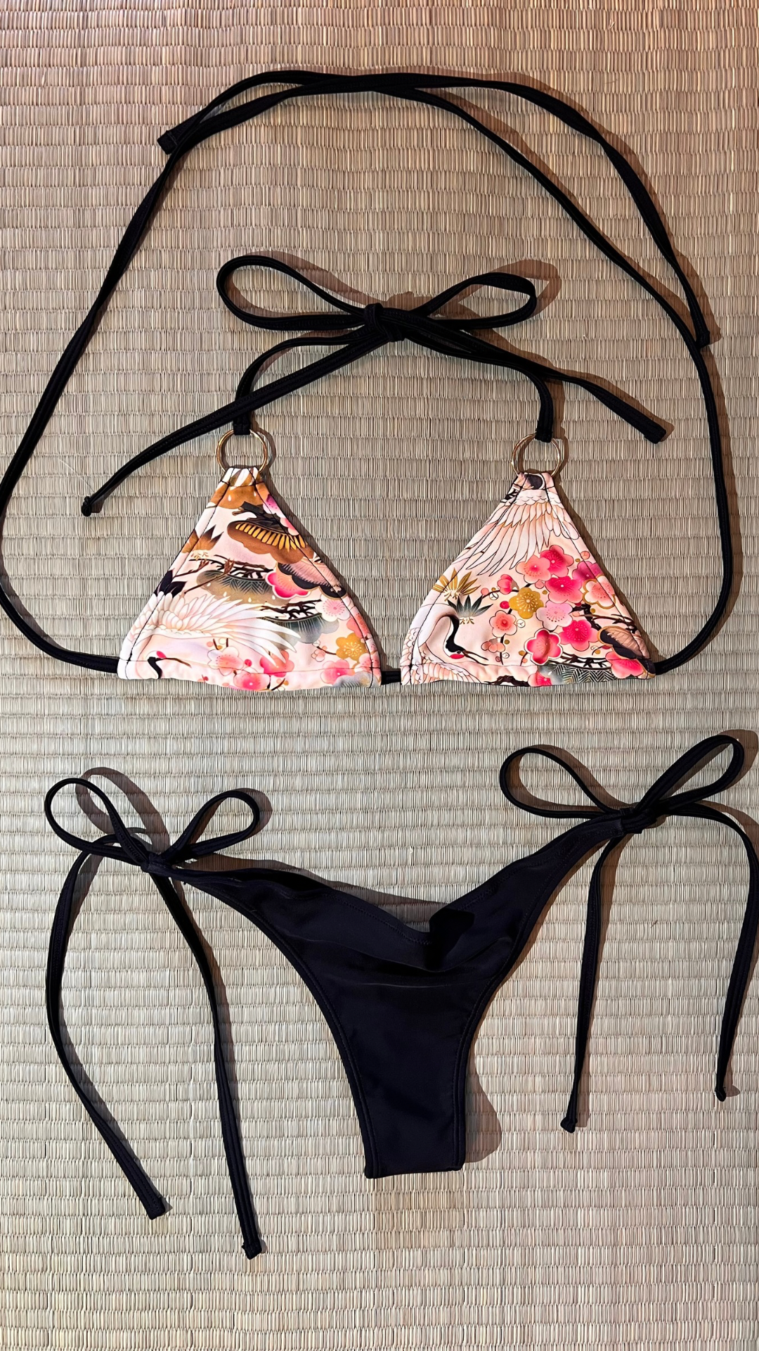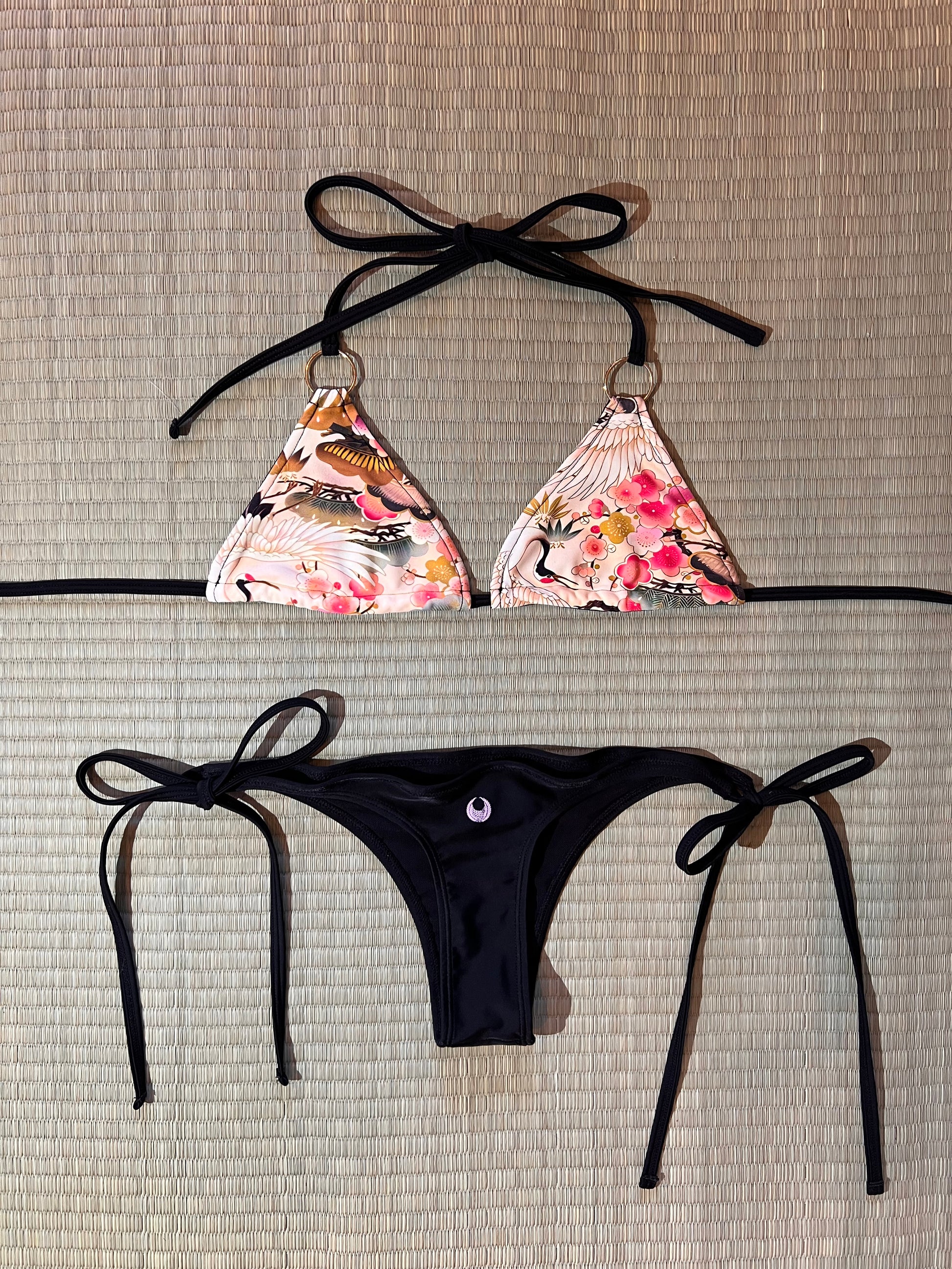 This 6-way reversible bikini brings together modern versatility and traditional Japanese elegance with its symbolic crane and floral motif.